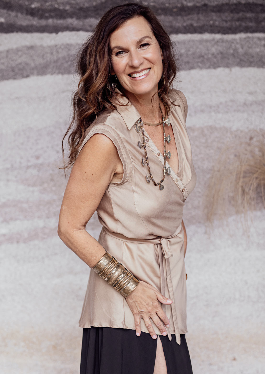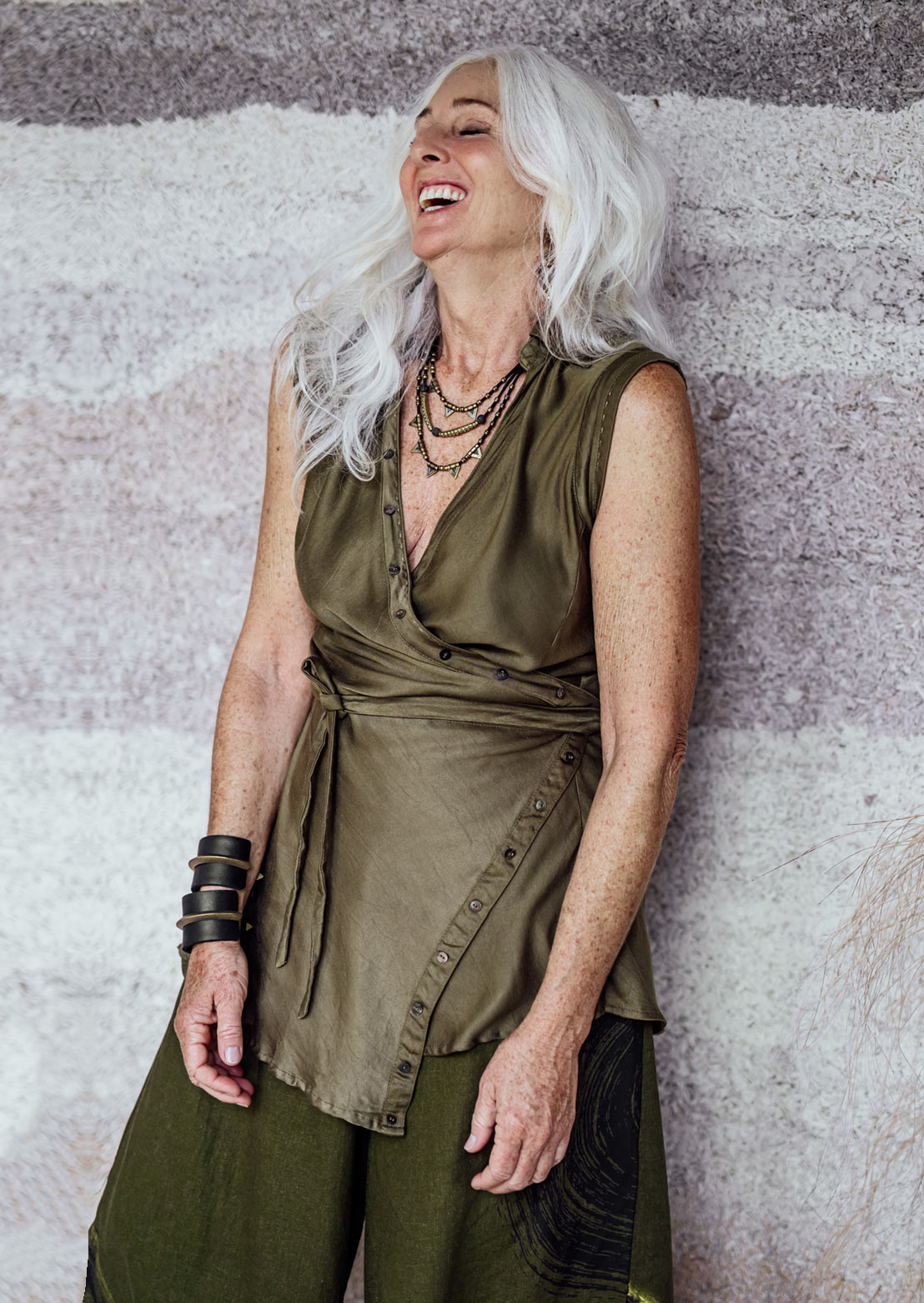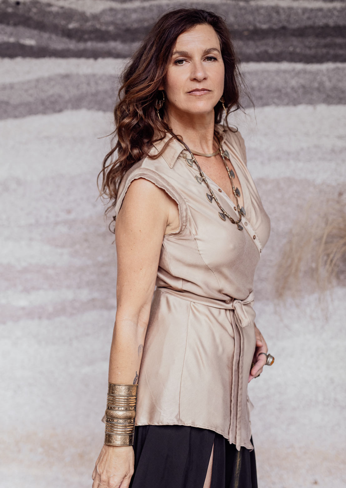 The Kumo Top is a creative, elevated twist on the classic buttoned shirt. Crafted from smooth bamboo satin, this wrap-style design features a row of small shell buttons- purely decorative - that add a touch of refined detail. Rolled sleeves and a long, wide hemline create a fluid, effortless silhouette perfect for an elegant workday or any sophisticated casual occasion.