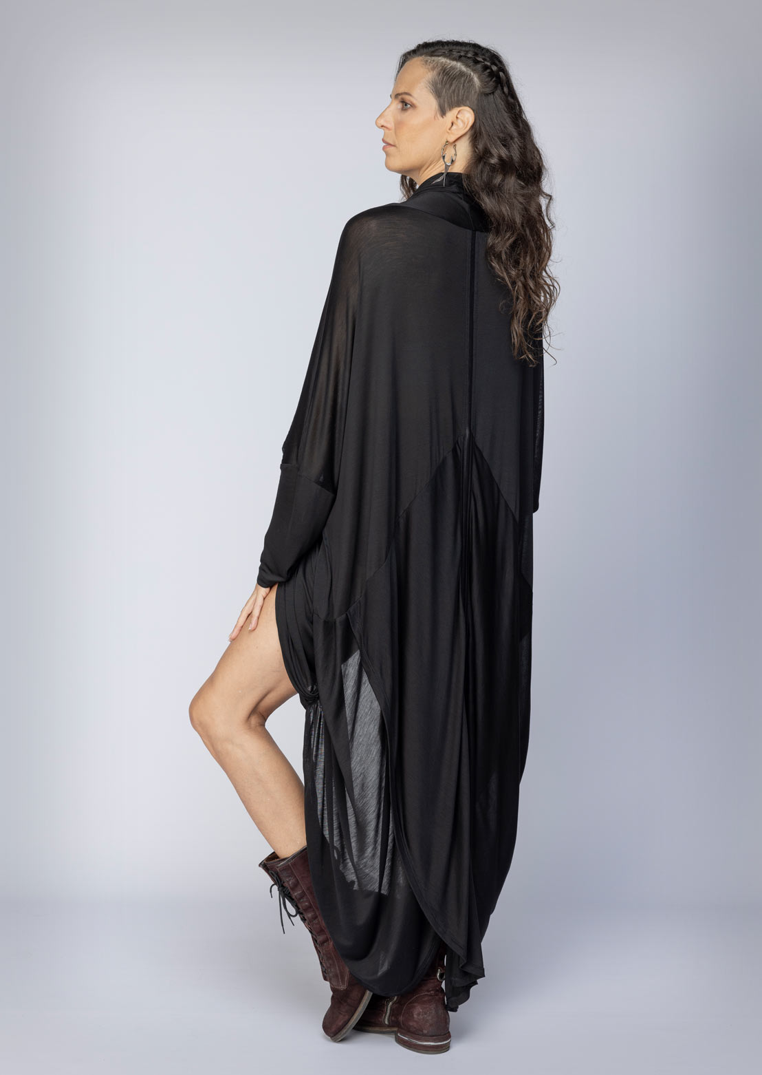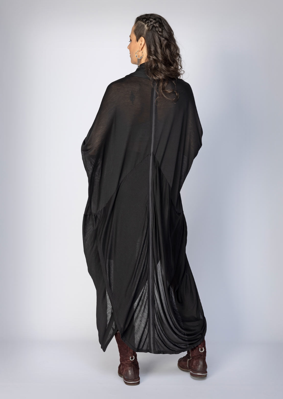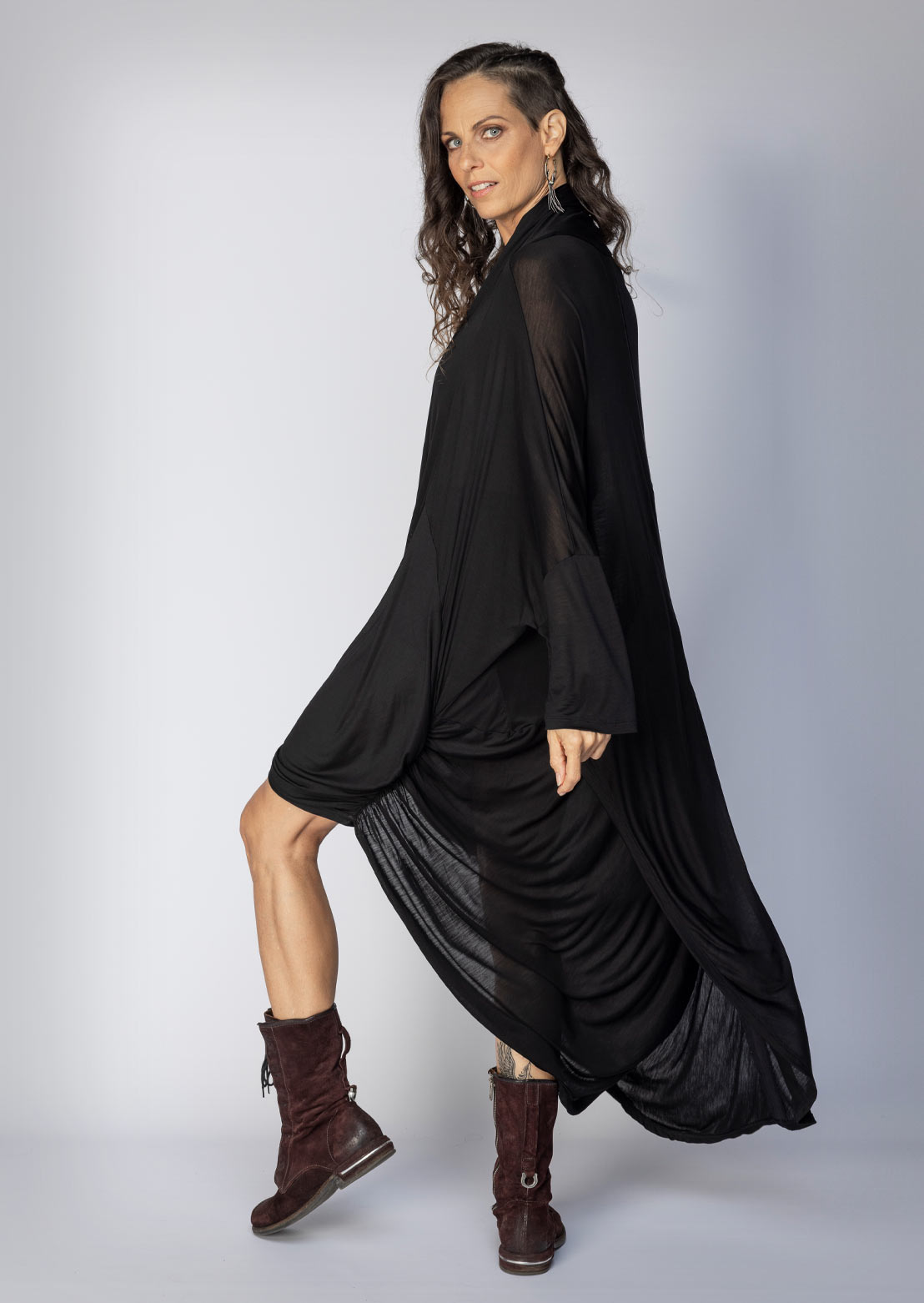 The Liquid Shroud Black is designed for women who want their clothing to be as mindful and adaptable as they are. Crafted from breathable, sustainable natural fibers, it’s a “minimalist black layering piece with relaxed fluidity” tailored to women aged 30–60—creative professionals, dancers, travelers, and those navigating menopause or midlife transitions. This piece is for those who want to honor body changes without sacrificing their values or aesthetic clarity.